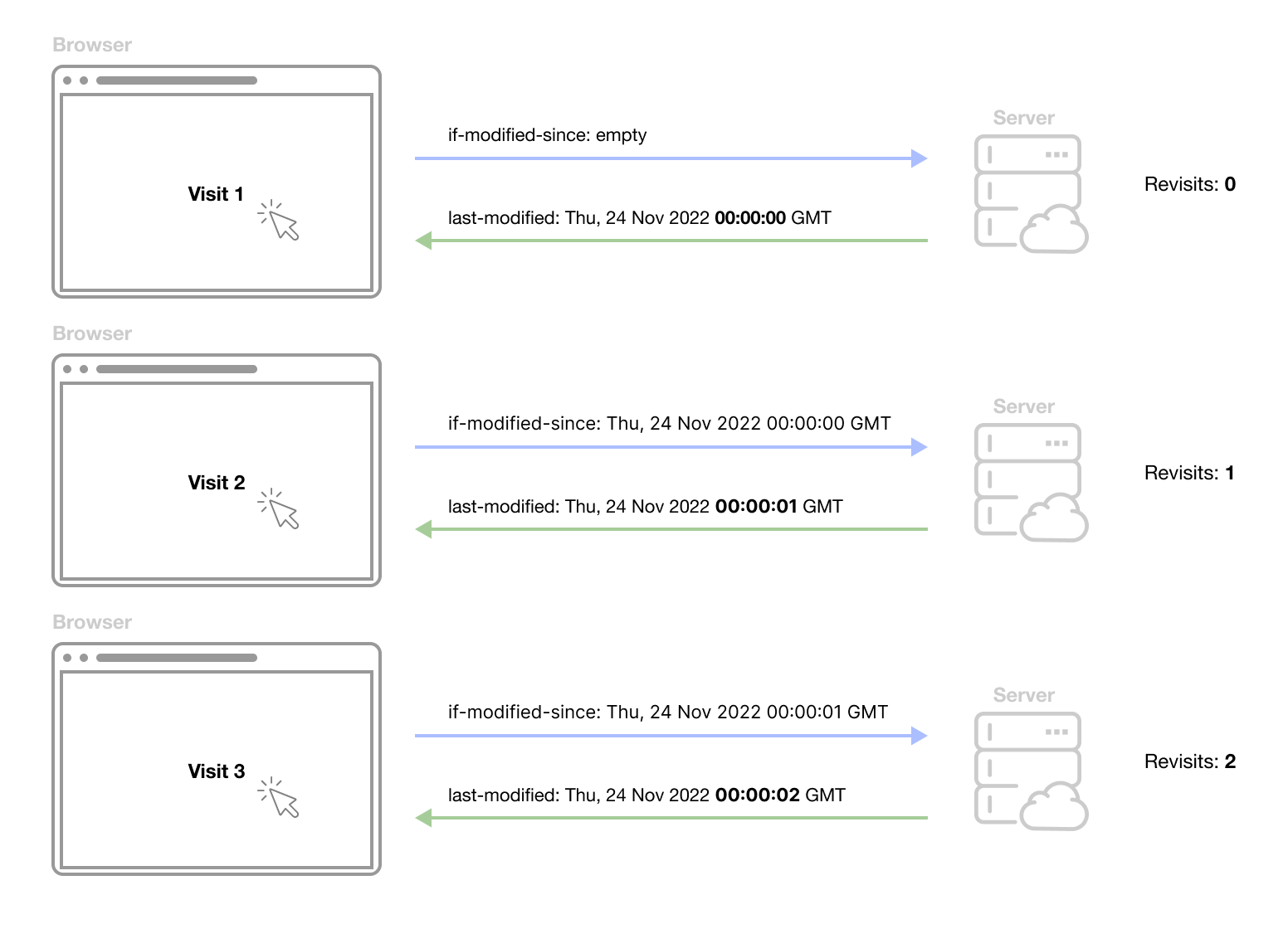 When the browser pings our server from a website for the first time, we send back a response with a header set to Cache-Control: no-cache, telling the browser to store the request in its cache but revalidate it with the origin server before each use. But most importantly, we send a header which is a date set to the beginning of each day: